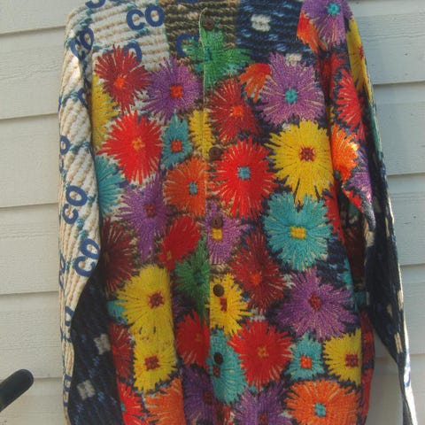 Naisten kirjava neuletakki, jossa on kissa-aiheinen kuvio. Koko XL XXL. Sopii rentoon pukeutumiseen ja tuo väriä asukokonaisuuteen. edessä napitus. 100 % polyamide, käsinpesu