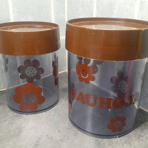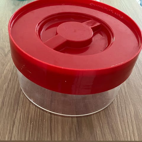 Säilytyspurkki jossa kierrettävä punainen kansi. Erik Kold.