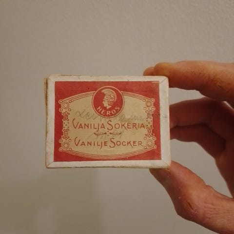 Vanillinsocker 55g, OTK Helsinki. Pohjassa pintaruostetta.