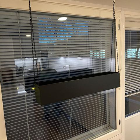 Metallinen, mustaksi maalattu amppelikoukku tai vaikka lyhdynroikotin. Kiinnitys rei-istä ruuveilla. Seinää vasten tulevan laakaraudan korkeus 27 cm, seinästä ulos 28 cm.