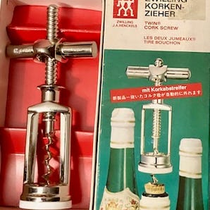 Vintage Stelton korkkiruuvi ja pullon avaaja alkuperäispakkauksessa. Pakkauksen mukana tullut pieni esite suunnittelijoista Arne Jacobsen ja Erik Magnussen sekä Steltonin tuotannosta.