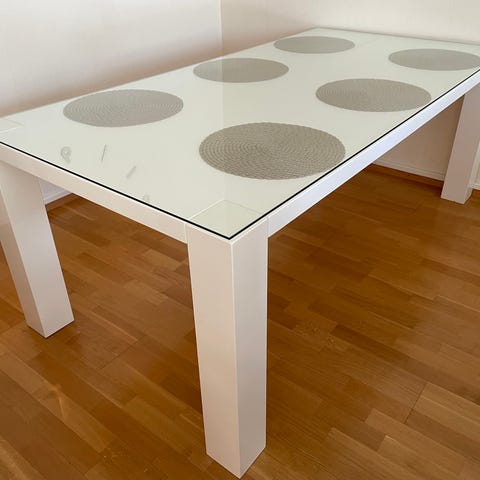 Valkea ruokapöytä, jonka kansi on valmistettu karkaistusta lasista. Pöydän mitat ovat 180-280 cm pituus ja 100 cm leveys. Sopii hyvin tilaviin ruokailutiloihin tai kokoustiloihin. Moderni muotoilu ja kestävä materiaali tekevät siitä käytännöllisen valinnan.
