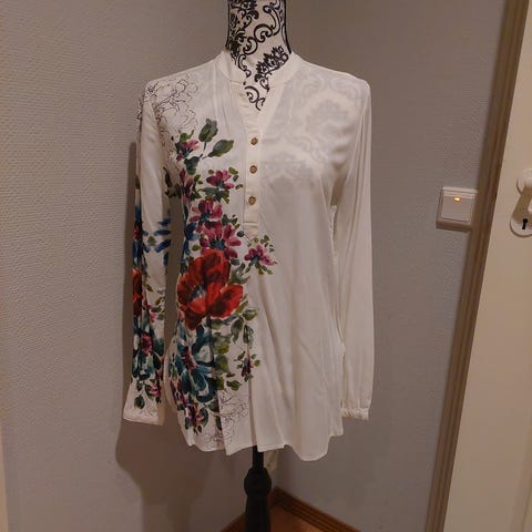 L kokoinen paita, joka vaikuttaa S / M-kokoiselta. Paljetein, helmin ja kimaltein koristeltu paita. Takana niskan lähellä hopean värisellä langalla ommeltu teksti "Desigual".