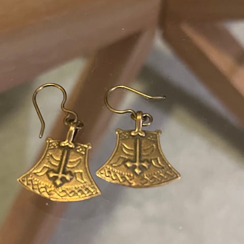 Myydään pronssinen Kalevala Korun Kuusamon Kirves -sarjan korusetti, johon kuuluu näyttävä kaulariipus sekä korvakorut (iso). Tämä sarja on saanut inspiraationsa suomalaisesta perinteestä ja voimakkaasta symboliikasta – kirves edustaa voimaa, suojaa ja itsenäisyyttä.
