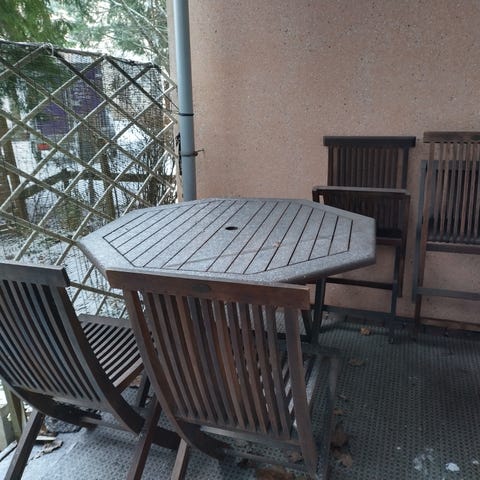 🪛Huomaa, että vaikka tuolit ovat taitettavat, pöytiä ei voi taittaa täysin kasaan. Pieni kokoaminen on tarpeen, mutta siihen kuluu enintään 5 minuuttia pöytää kohden, ja se hoituu helposti yhdellä henkilöllä.