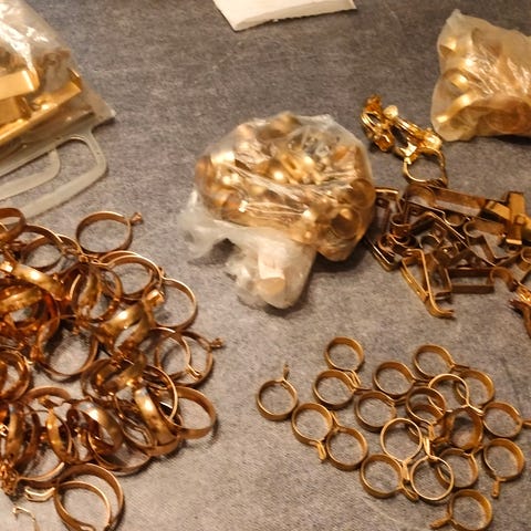 Pyöreään verhotankoon sopivat 4,5cm leveät verhorenkaat, sisältä halkaisija 4cm. Painavat, metallia ja tehty antiikkimessingin näköiseksi.