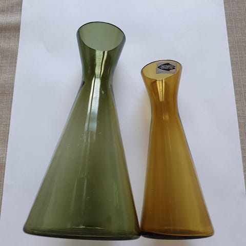 Korkeus noin 20,5 cm, suuaukon halkaisija noin 4,5 cm, pohjan halkaisija noin 8,5 cm, painaa 140 g. Nämä ovat olleet tuotannossa 1954-1968 ja niitä on tehty neljää eri kokoa ravintoloiden käyttöön. Karahvi on todella hyväkuntoinen lukuunottamatta pohjassa olevaa pientä viirua/kulumaa). Toimituskulut lisätään, ei toridiiliä.