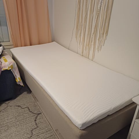 Kokonaisuuteen sisältyy kaksi 80 cm leveää runkopatjaa, Hilja-petauspatja 160*200, massiivikoivusta valmistetut Quader Light -sängynjalat, Sängynpääty Slim,ja helmalakana full skirt. Värinä päädyssä ja helmassa on caleido 3798 vihreä. Toisen runkopatjan kovuusaste on tukeva ja toisen medium.