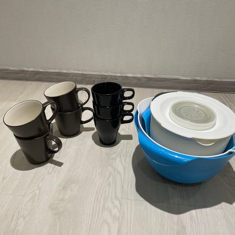 Kermakko kerran yhteenliimattu. Muut astiat ehjiä, mutta osittain kuluneita.