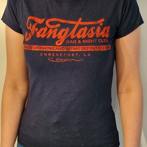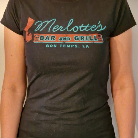 Aito True Blood -tv-sarjan virallinen fanituote, valkoinen naisten t-paita 'Merlotte's Bar & Grill'. Koko S.