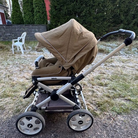 Brio Combi yhdistelmärattaat seisomalaudalla. Tukevat ja turvalliset, kuomu on kuitenkin auringossa jo haalistunut. Kääntyvä aisa, pehmeä koppaosa, seisomalauta, sadesuoja ja rengassuojat mukaan. Taitaa olla myös jonkinlainen makuupussi mukana. Hyvät vaunut vaikka mökille tai parvekkeelle!