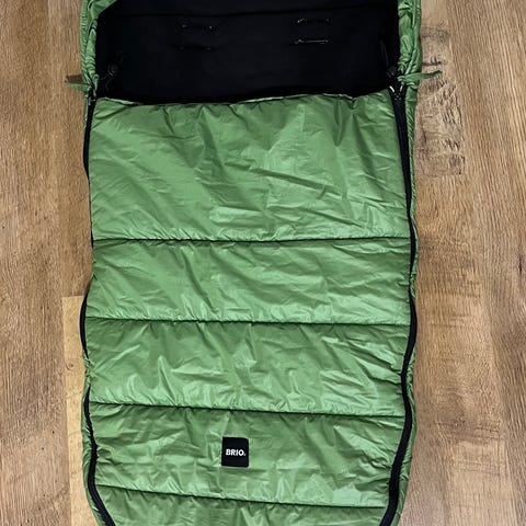 Brio lämpöpussi, turvavyö aukot, tasku ja irroitettava huppuosa.