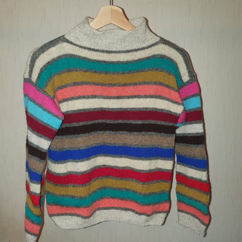 Käsin paksusta langasta neulottu paita. Ei ollutkaan itselle mieluinen väri ja jäänyt käyttämättä. Kainalo - kainalo n. 48 cm, pituus olka - helma n. 54 cm, hihan pituus kainalosta n. 57 cm.
