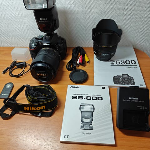 Mukana tulee vähän käytetty Nikon D5300 -järjestelmäkameran runko, Nikonin AF-S Nikkor 18–55 mm:n objektiivi, kantohihna, laturi ja SanDiskin 8 Gt:n Extreme Pro -muistikortti.