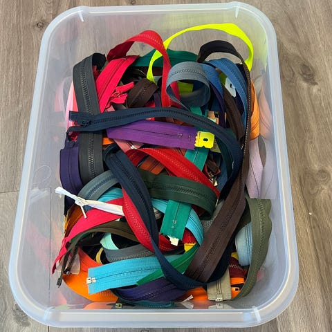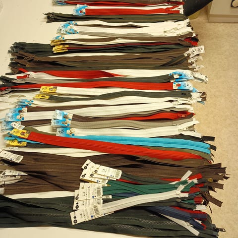 Kuvan koko läjä uusia erilaisia vetoketjuja, muutamia lankarullia- tässä arvion mukaan yli 100 vetskaria. Piiloketjuja, avoketjuja jne. Myydään kaikki yhdessä 80€