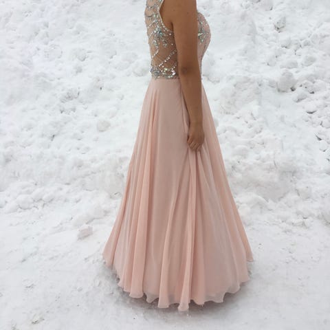 Edellisen tanssijan pituus n.170cm, helmaa voi tarvittaessa lyhentää. Selässä nyöritykset millä mekon kokoa voi säädellä.