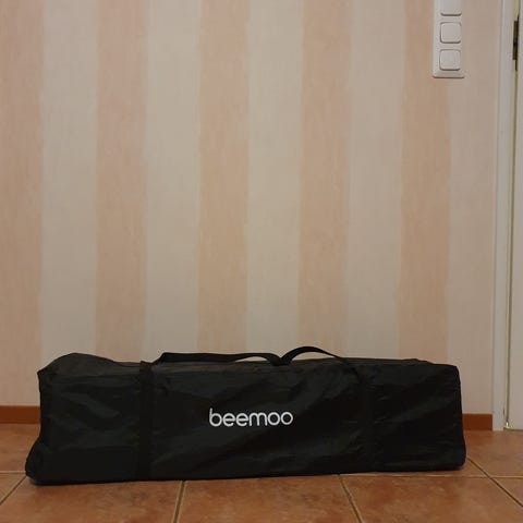 Koko 100x100x81 avattuna. Oma kantolaukku mukana. Yhdellä sivulla vetoketjullinen ovi. Muuten hyvässä kunnossa, mutta katossa on pieni vaurio.