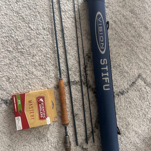 Setit sis. Vision vapa ja kela, ja siimat sekä suojaputki. Niillä pääsee alkuun.. Kaupan päälle pussillinen perhonsidontamateriaaleja, pussit rakenteilla..