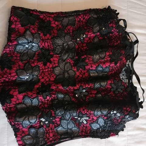 Kaunis juhlatoppi tai käy myös hääpuvun yläosaksi. Hyvin kaunis luonnon vaalea paksu satiini, jossa kaunis brodeeraus. Kerran käytetty häissä ja sen jälkeen pesty. Huom! Kaulakoru ei kuulu hintaan vaan ostettavissa erikseen (kaulakoru 9 e).