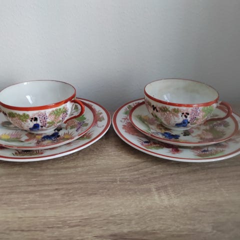 Japanilainen kuppipari ja kuppien aluslautaset, punasavea, kiiltävä lasitus, pohjassa JAPAN