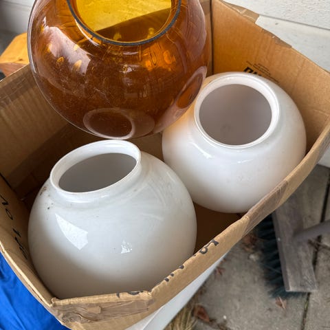 Myydään vanha iso lampun kupu maitolasia. Korkeus 25cm suuaukko 11cm
