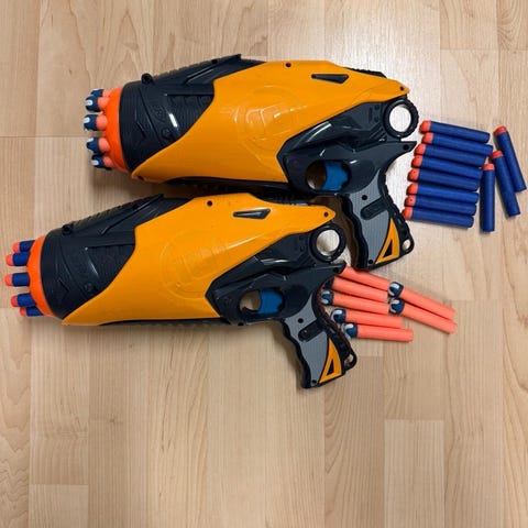 Hyvässä kunnossa olevia nerfejä kaikki toimii lipallisiin tulee täydet panokset paitsi isoimpaan ja pikku pyssyihin about kaikkiin panokset Osa nerfeistä on patterilla toimivia ja nekin toimivat hyvin on kokeiltu ja kuvaan vielä lisäksi yksi 10 panoksen lipas löytyi (siihen ei panoksia mukaan) voi tulla viestiä laittamaan mikä kiinnostaisi sitten katsotaan hintaa mutta halvalla lähtee! Koko läjä voisi 60€ lähteä saa tarjota! Voi ostaa myös erikseen