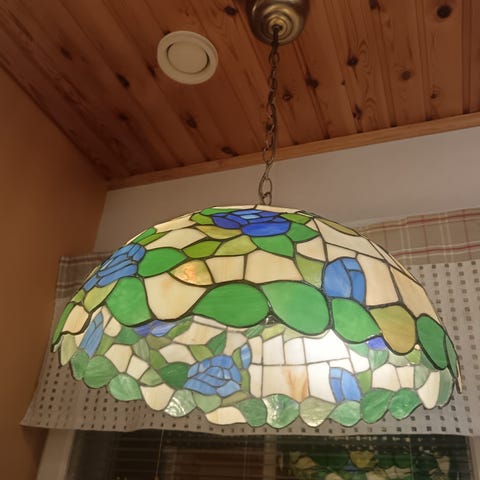 Valaisinliikkeessä esillä ollut( käyttämätön) Tiffany-valaisin. Valaisimen korkeus 50cm,kokonaiskorkeus kettingin ja kupin kanssa noin 125cm. Leveys 25cm. E27 poltin.