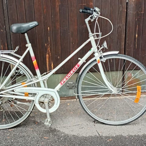 Valkoinen Peugeot merkkinen naisten pyörä.