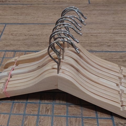 Myydään 12 kpl lasten puisia vaatehenkareita.
