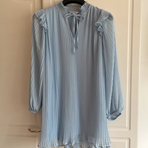 Kappahlista ostettu vaaleanpunainen mekko. Kokomerkintä M. Olen 165cm pitkä ja on n. polveen ulottuva itselleni. Väljästi laskeutuva kevyt mekko. Muutamia pieniä langanvetoja voi löytää oikein tarkasti etsien. Käytössä eivät mielestäni näy - sen verran paljon kangasta ja pliseerausta. Värit ei enää uuden kirkkaat. Yhä siisti käytetty kuitenkin.