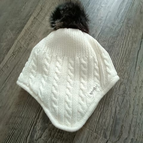Newbien suloinen valkoinen pipo mustanruskealla tupsulla ja korvaläpillä, fleecevuori, koko 40/42. Erittäin hyvä, käytetty kunto.