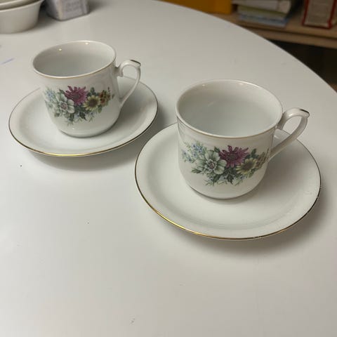 Kahviastiasto on Ruotsalaista Gefle- keramiikkaa ja siihen sisältyy kermakko, neljä kuppia ja kuusi lautasta.
