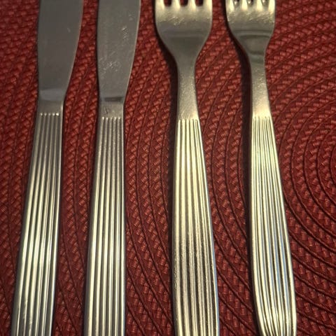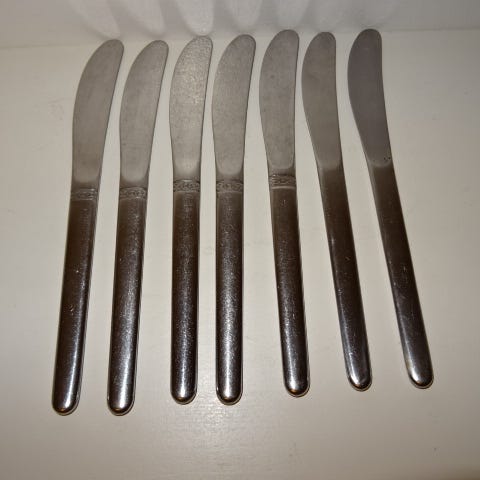 Hackmanin valmistamia ruokaveitsiä, joista neljän pituus on 21 cm ja kahden 19,5 cm. Kauniit pyöreähköt otinpäät joiden reunaa kiertää ura. Terissä teksti Hackman Finland Stainless. Veitsi. Toridiili