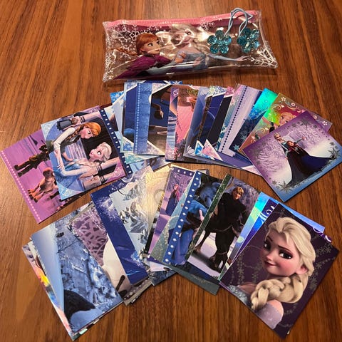 En tiedä mistä keräilysarjasta nämä ovat, niitä kun on ollut jo useampia. Tarrojen taustapuolella Anna ja Elsa halaavat toisiaan ja englanninkielisessä tekstissä lukee "From the movie Disney Frozen". Keräilyvihkoa minulla ei ole.