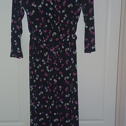 Dorothy Perkins juhlamekko kukkakuviolla. Läpinäkyvä yksityiskohta helmassa. Selässä solmittava kangasvyö. Puuvillaa, aavistus joustoa. Takana vetoketju. Hyvä kunto. Sisäpuolella langannousuja saumoissa, eivät näy ulospäin. Pohjaväri todella tummansininen, jopa musta? Koko 42.