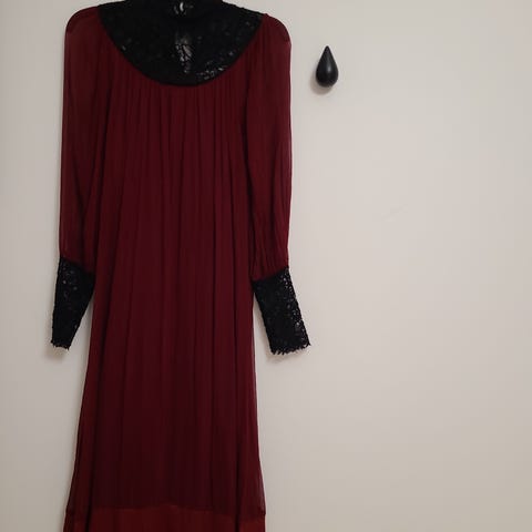 Marita Huurinainen väljä mekko kauniisti laskeutuvilla leveillä hihoilla. Musta kuviointi näkyy valon osuessa oikeasta kulmasta. Materiaali 58% pellavaa ja 42% cuproa. Ostettu käytettynä, joten en voi taata hajusteettomuutta. Toisen kainalon saumasta korjasin käsin pikkuruisen reiän. Kainalo näkyy viimeisessä kuvassa. Kai-kai 46cm, olka-helma 95cm. Sopii arkeen ja juhlaan. Tämä ihana mekko olikin itselleni harmillisesti liian pieni.