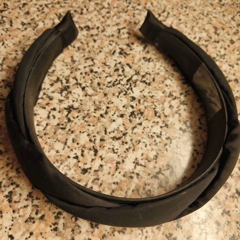 Erittäin vähän käytetty, joustava lehti-aiheinen hiuspanta. Lehdet ovat kullanväristä metallia, ja lehtien kummallakin puolella on kohotettu lehtiruoti-kuviointi, toisella puolella hennommin ja toisella puolella voimakkaammin. Joustava osuus on leveää mustaa kuminauhaa, jossa on mukavasti joustoa. Puoliksi taitettuna mitaltaan 25,5 cm. Koko pannasta puolet on kuminauhaa.