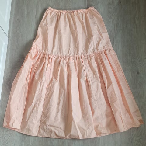 Hyvänmallinen pitkä vähän alaspäin levenevä vaalean beige hame. Hameessa on edessä pitkä halkio (n. 40 cm), siinä on muotolaskokset edessä ja takana ja takana on myös vetoketju. Hame on vuoritettu. Hameessa ei ole valmistaja-, koko- eikä materiaalitietoja. Se näyttäisi ompelijan tekemältä. Arvelisin hameen materiaalin olevan jotakin kevyttä villasekoitetta. Materiaali on pehmeää kauniisti laskeutuvaa, mutta kangas ei jousta. Hameen kooksi arvelisin M koon.