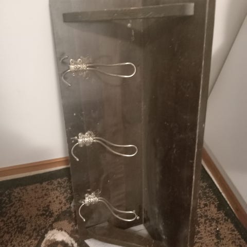 Vanha hattuhylly jossa 3 pirunpää/ukonpää-koukkua. Kulumaa, mutta ikäänsä nähden siisti. Ikää en osaa arvioida, mutta vanha. Kolme koukkua ripustamiseen. Sijaitsee Hietalahdenkadulla, vain nouto
