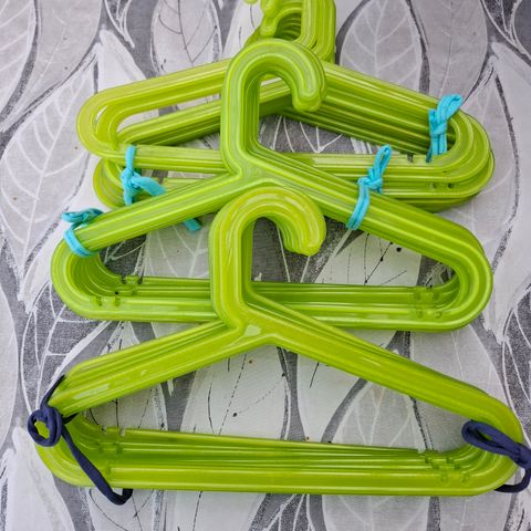 Muoviset värikkäät henkarit. Myynnissä myös muualla.