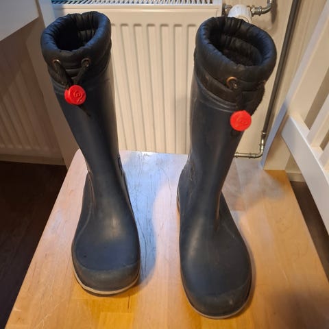 Lähes käyttämättömät Nokian mustat lämpökumpparit koossa 34. Ainoa ”vika” jonka löysin on toisen kengän kiristyskuminauhan ohenema (katso kuva).