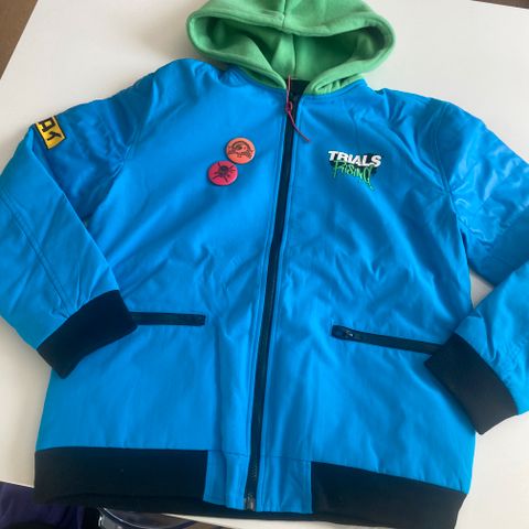 Tummansininen välikausitakki. Irrallinen huppu. Taskut. Oikeassa hihassa korjattu pieni reikä. Huomaamaton.