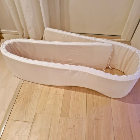 Muuten siisti reunapehmuste pinnasänkyyn, mutta jostain tullut pari haaleaa läikkää pehmusteeseen (kuva2) ei lähtenyt pesussa. Pari narua käsin myös ommeltu kiinni kun lähtenyt irti. Muutoin hyvässä kunnossa, yhdellä lapsella käytetty vuoden verran.