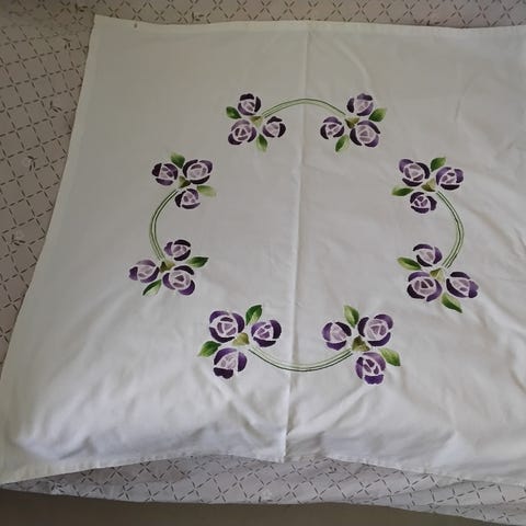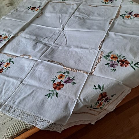 Joitakin kukka kirjontoja olen uusinut joissakin lehti kirjonnassa on kulumaa,joka ei omasta mielestäni ole häiritsevää,joka vain kertoo siitä että liinaa on pidetty,ja tietysti liina kankaassa on ne paikkaukset.Yritän vanhasta muokata vielä käyttökelpoista.