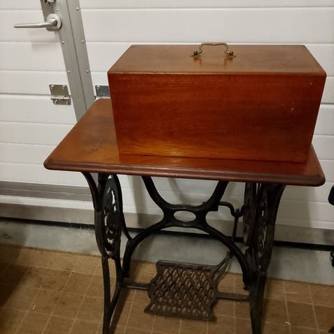 Luokan 15 poljettava Singer-ompelukone, C-sarja, joten valm. Saksassa Wittenbergin tehtaalla, jonka sarjanumerotiedot ovat II ms. jäljiltä häviksissä. Kuitenkin seitsennumeroinen sarjanumero, joka yhdessä sähkökoneen käyttöönotto-ohjeen kanssa paljastaa 1930-lukulaiseksi.