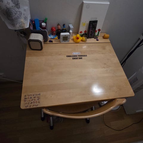 Hyväkuntoinen valkoiseksi maalattu lasten pulpettisetti.