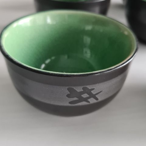 Teesetti eli teekannu ja neljä mukia. Kuvituksena elämänpuita ja lintuja. Käsinmaalatut, joitakin maalivalumia. Ehjät.