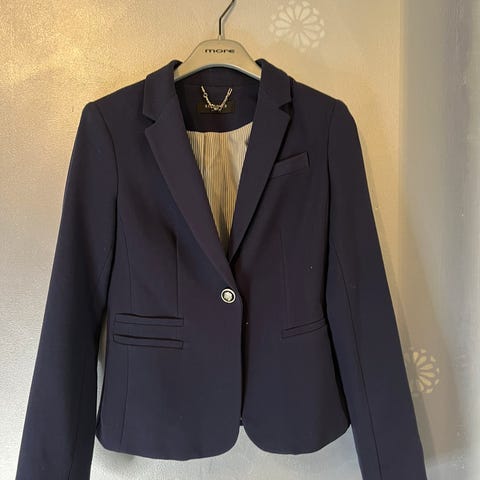 Hyvin kokomerkintäänsä 38 vastaava bleiseri, laivastonsininen. Hihansuita kääntäessä tulee näkyviin sinivalkoraidallinen vuori.