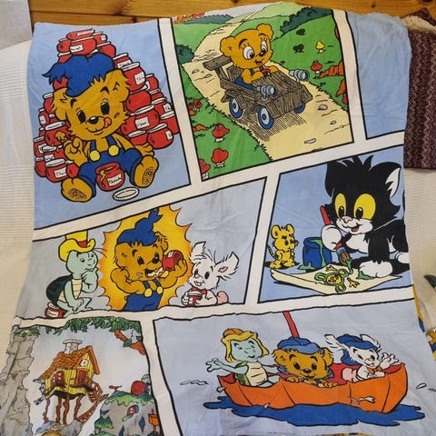 Myyntiin hyväkuntoiset Bamse-pussilakana (130x109 cm) ja tyynyliina (36,5x43 cm).