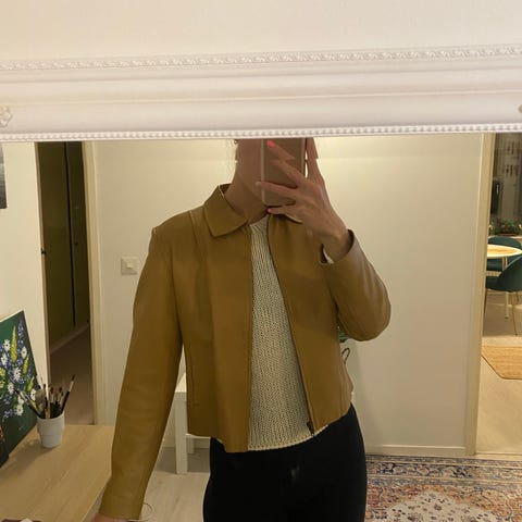 Myynnissä näyttävä punainen takki. Hihat itselle liian lyhyet. Takissa ei ole mitään lappuja tallella, mutta arvioni mukaan tämä on keinonahkaa ja L kokoa. Muutama pieni reikä niskassa vuoressa ja pientä kulumaa olkapäässä.